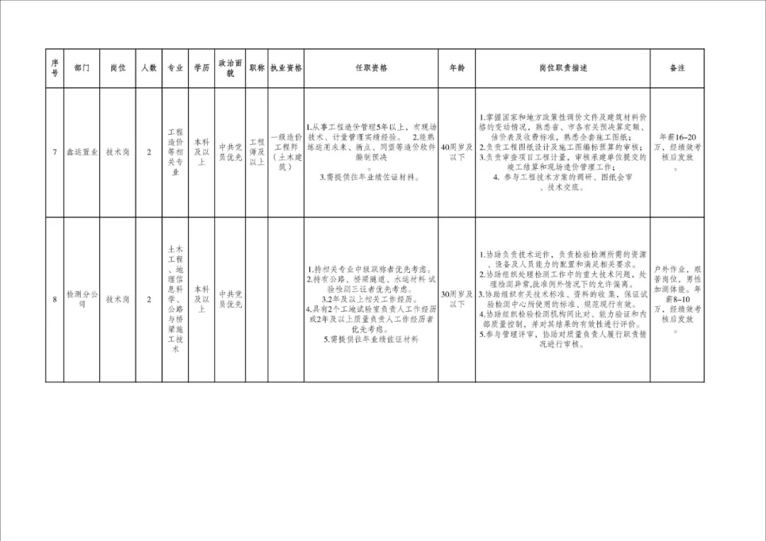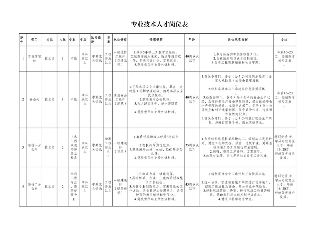 公開招聘持有一級建造師等資格證書、具有項目管理經(jīng)驗和一定業(yè)績的專業(yè)技術(shù)人才15名,具體要求詳見附件(專業(yè)技術(shù)人才崗位表)。