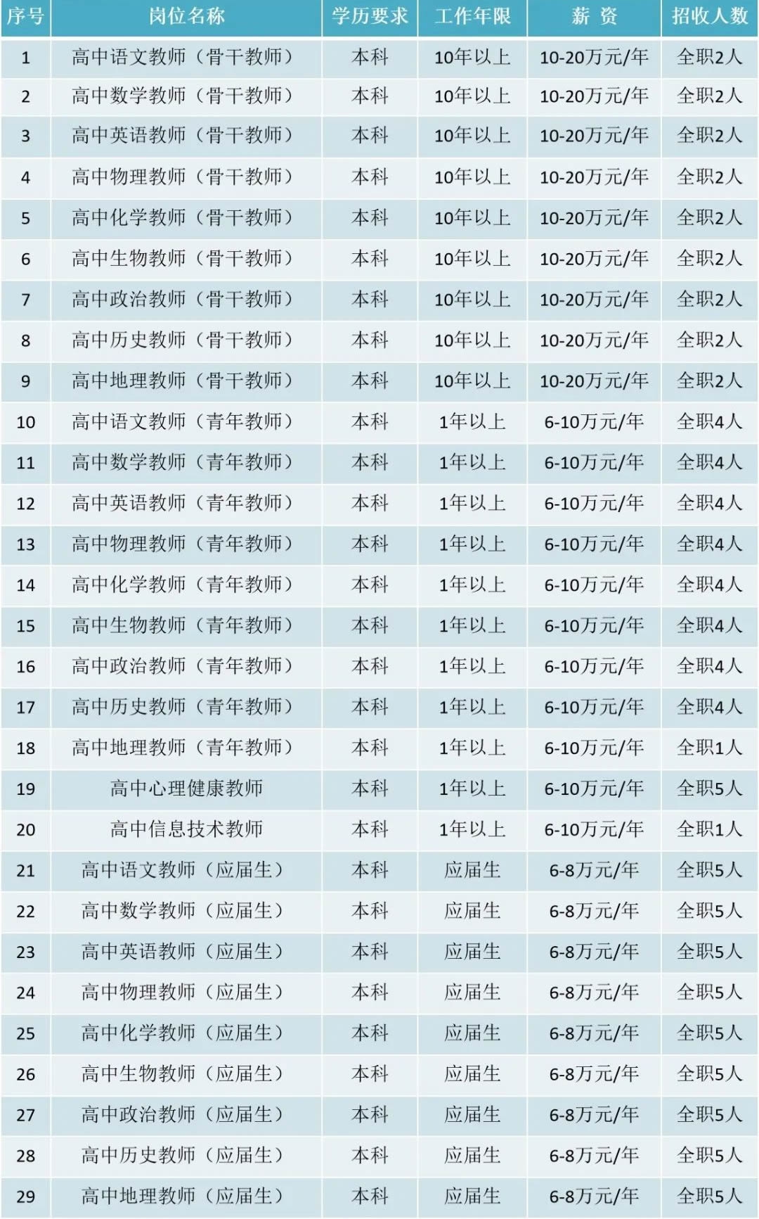 語文、數(shù)學(xué)、英語、物理、化學(xué)、生物、政治、歷史、地理、信息技術(shù)、心理健康等學(xué)科教師。