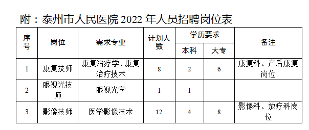 為做好2022年人員招聘考試工作,泰州市人民醫(yī)院決定招聘合同制工作人員21名?,F(xiàn)將有關事項公告如下: