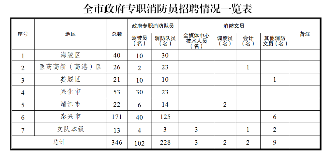 為更好護航泰州市社會經(jīng)濟發(fā)展,不斷提升綜合消防救援能力,根據(jù)各地消防救援隊伍建設(shè)實際,泰州市消防救援支隊面向社會公開招聘346名政府專職消防員(附表1)?,F(xiàn)將有關(guān)事項公告如下: